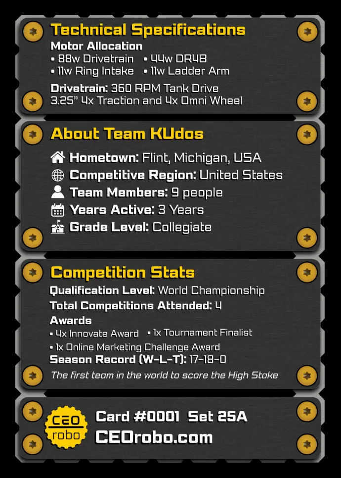 Established in 2022, KUdos is a collegiate robotics team that competes in the VEX-U Robotics Competition. With our fourth year competing on behalf of Kettering University, we thrive on a hybrid model that brings together both A-Section and B-Section members, allowing us to balance on-campus
